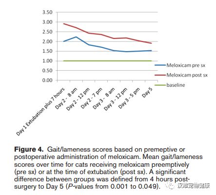 注释:术前使用美洛昔康组的步态/跛行评分比术后使用组要显著性降低,说明术前使用美洛昔康对步态的恢复效果好。